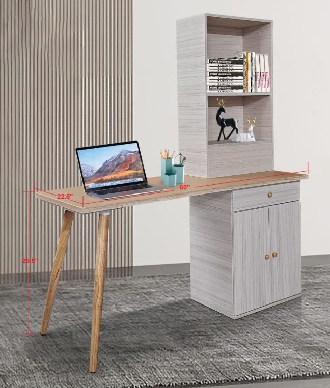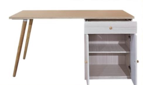 - Writing table comes with open storage cabinet and drawer